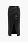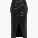 A standout detail is the stylish draped knot at the waist, which creates a subtle gathered effect that enhances the shape and adds visual interest. The front slit provides freedom of movement while introducing a touch of allure, making it perfect for pairing with heels, boots, or minimalist sneakers. The structured yet comfortable design allows it to transition seamlessly from casual outings to dinner events or nights out. Whether styled with a fitted top, a cozy sweater, or a tailored blazer, this skirt elevates any outfit with its sleek and confident aesthetic.