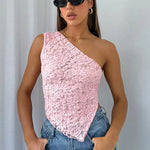 Dieses asymmetrische Spitzentop verleiht jedem Outfit einen Hauch von Raffinesse und Sinnlichkeit. Das One-Shoulder-Design in Kombination mit der zarten Spitze sorgt für einen auffälligen und femininen Look. Die subtilen Details machen dieses Oberteil perfekt für einen Abend aus oder besondere Anlässe.
