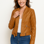 Crafted from high-quality faux leather, this jacket offers the stylish appearance of genuine leather while remaining lightweight and comfortable for everyday wear. The slim fit design creates a flattering silhouette that pairs effortlessly with a wide range of outfits. Its structured shape adds a refined touch, while the zipper details and classic biker styling give it a fashionable edge.
