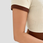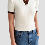 • Design: Kurze Ärmel, gerippte Struktur, kontrastierender Kragen.